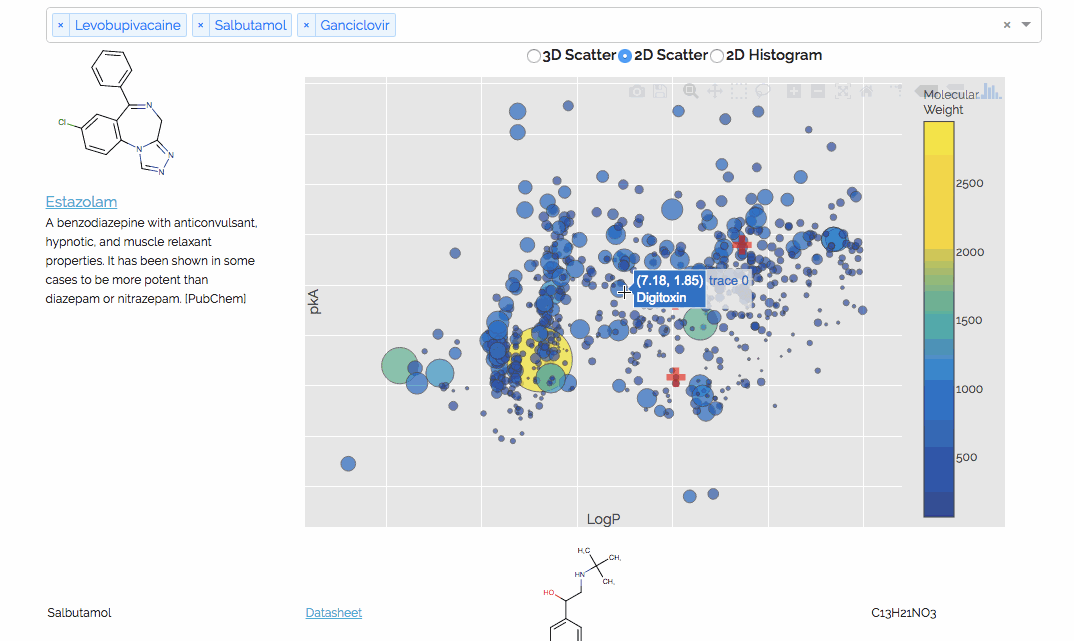 Explore chemical properties with this drug discovery app. As you hover over points, rich meta information about the drug is displayed in real-time. Buttons above the chart allow you to switch between visualizations.