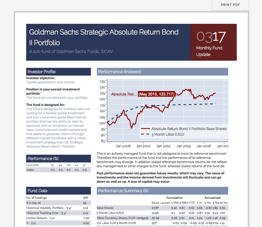 This Dash App is branded just like a Goldman Sachs report through the use of custom CSS. It includes a "Print to PDF" button and is formatted to look great on both the web and in PDF form. On the web version, the charts are interactive.
