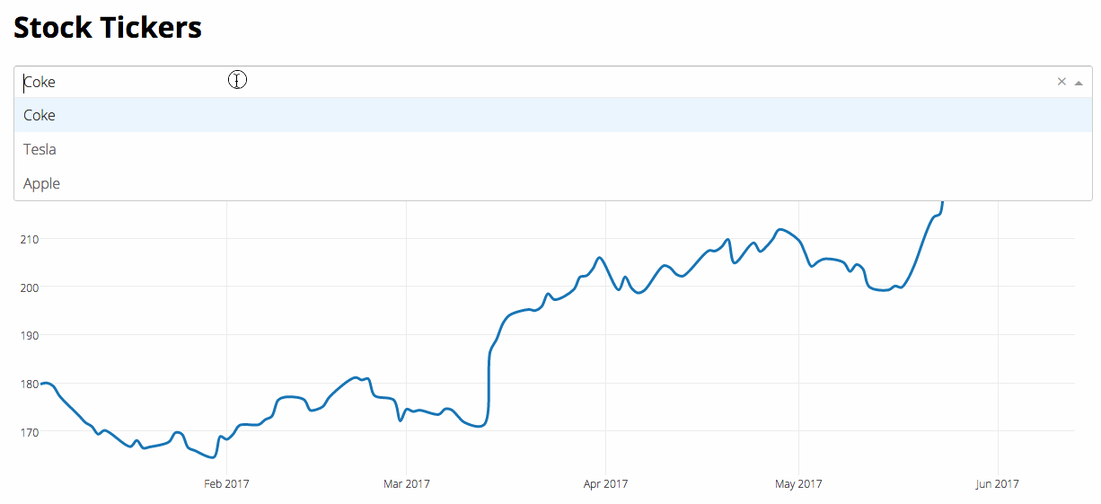 1 2 3 4 5 6 7 8 9 10 11 12 13 14 15 16 17 18 19 20 21 22 23 24 25 26 27 28 29 30 31 32 33 34 35 36 37import dash from dash.dependencies import Input, Output import dash_core_components as dcc import dash_html_components as html from pandas_datareader import data as web from datetime import datetime as dt app = dash.Dash() app.layout = html.Div([ html.H1('Stock Tickers'), dcc.Dropdown( id='my-dropdown', options=[ {'label': 'Coke', 'value': 'COKE'}, {'label': 'Tesla', 'value': 'TSLA'}, {'label': 'Apple', 'value': 'AAPL'} ], value='COKE' ), dcc.Graph(id='my-graph') ]) @app.callback(Output('my-graph', 'figure'), [Input('my-dropdown', 'value')]) def update_graph(selected_dropdown_value): df = web.DataReader( selected_dropdown_value, data_source='google', start=dt(2017, 1, 1), end=dt.now()) return { 'data': [{ 'x': df.index, 'y': df.Close }] } if __name__ == '__main__': app.run_server()