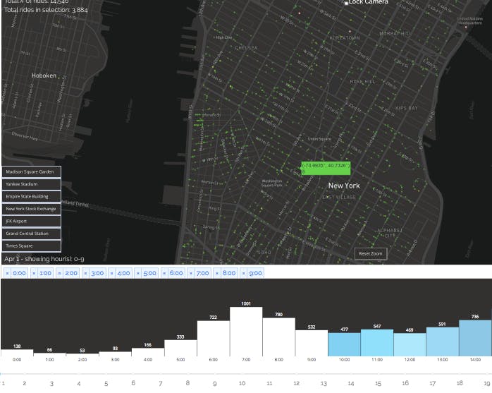 This Dash App displays the departure of all Uber rides in 2014. A histogram below map displays the popularity of rides and selecting different hours filters data in the map.